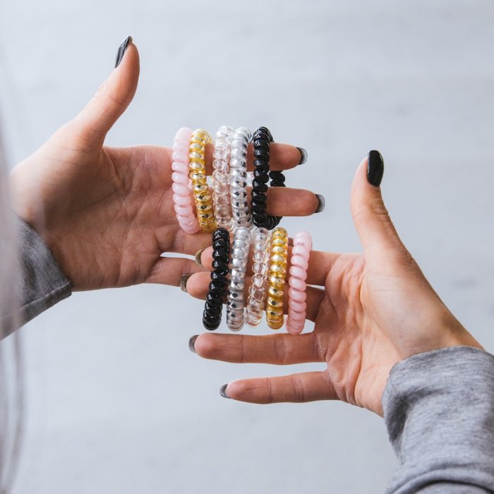 Dessa populära gummiband håller håruppsättningar och svansar på plats. Det elastiska materialet möjliggör även en sista snurr för det sista (hopplösa) varvet runt ditt hår. Hemligheten bakom är den smarta knorrformade designen (likt en telefonsladd) som automatiskt drar ihop sig och håller svansen på plats.